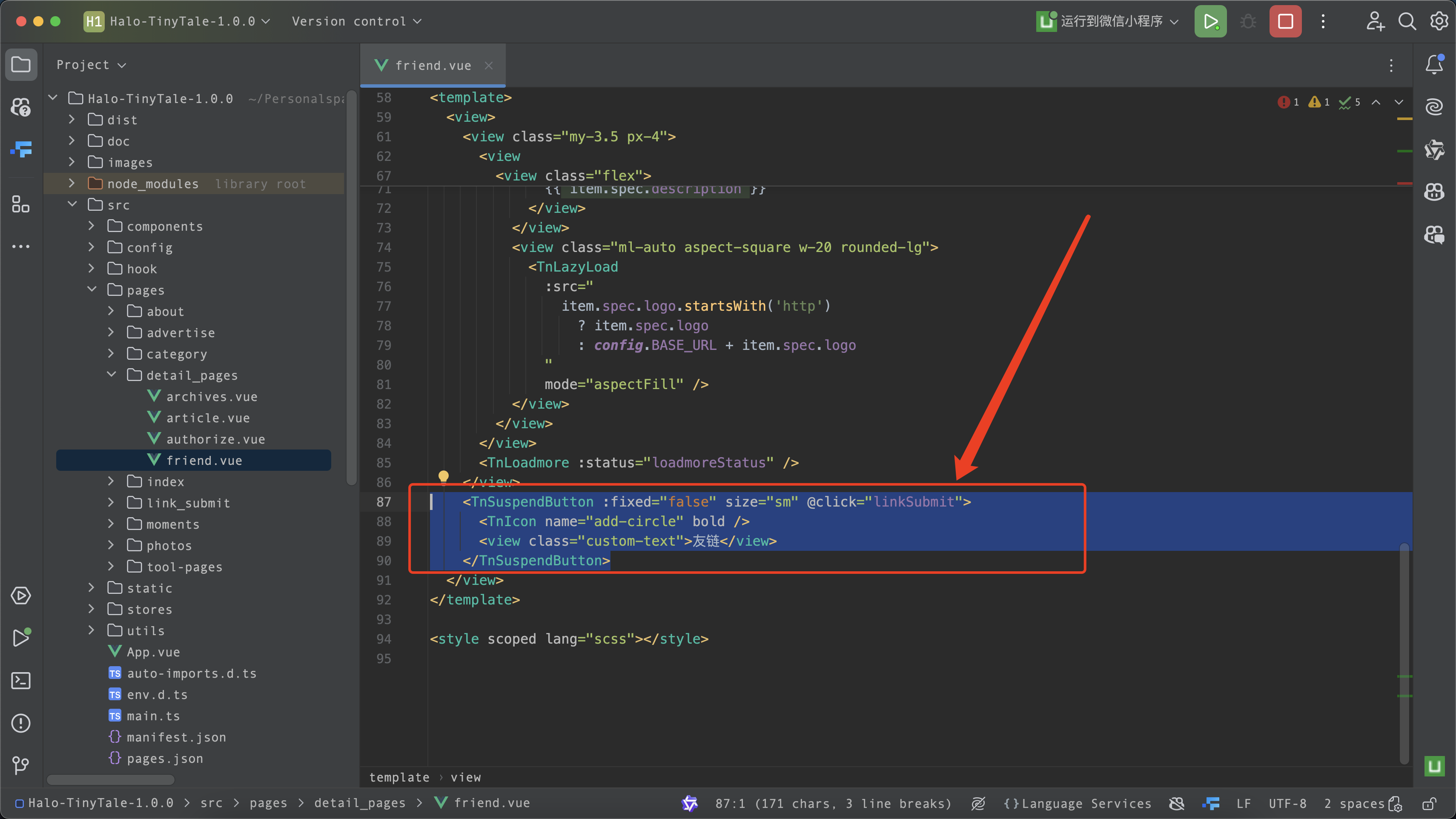 src/pages/detail_pages/friend.vue页面,引入组件,代码如下: